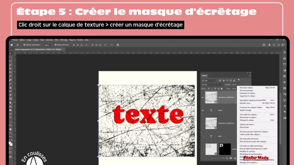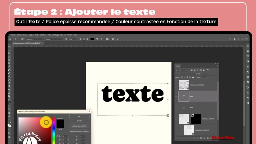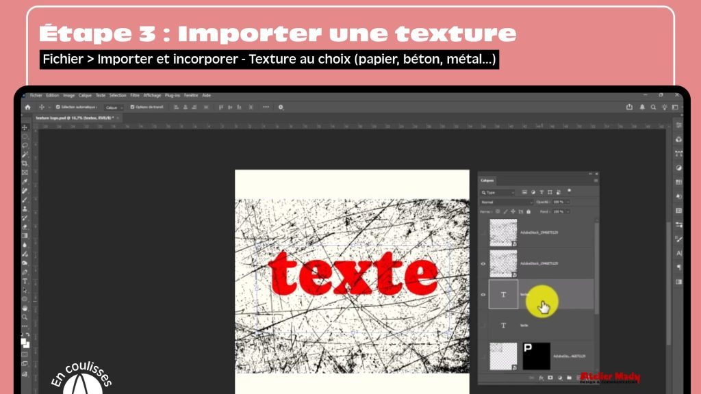 “Les modes de fusion permettent de mélanger la texture avec la couleur du texte. C’est ce qui va vraiment donner l’impression que la matière fait partie des lettres.”