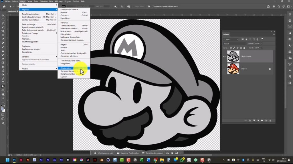 → Raccourci : Ctrl + Shift + U→ ou menu : Image > Réglages > Désaturation